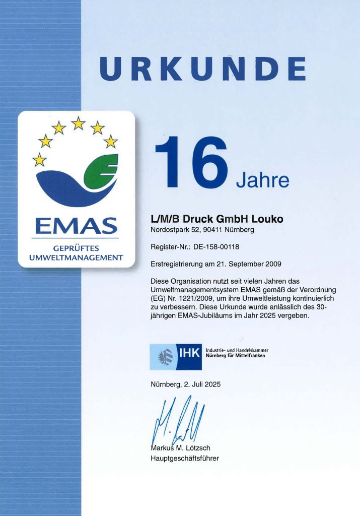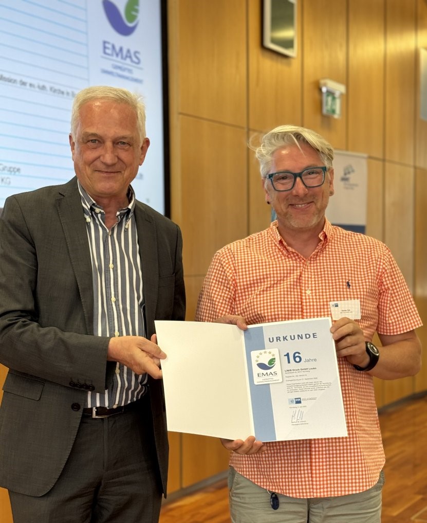 Zum Ende der Veranstaltung wurden die Teilnehmer für Ihre langjährige Nutzung des Umweltmanagementsystems geehrt. Der Leiter des Geschäftsbereichs „Innovation | Umwelt“ der IHK, Herr Dr.-Ing. Robert Schmidt überreichte der L/M/B Druck GmbH Louko, vertreten durch deren Umweltbeauftragten Herrn Günter Zeh, eine Urkunde für 16 Jahre Zugehörigkeit.