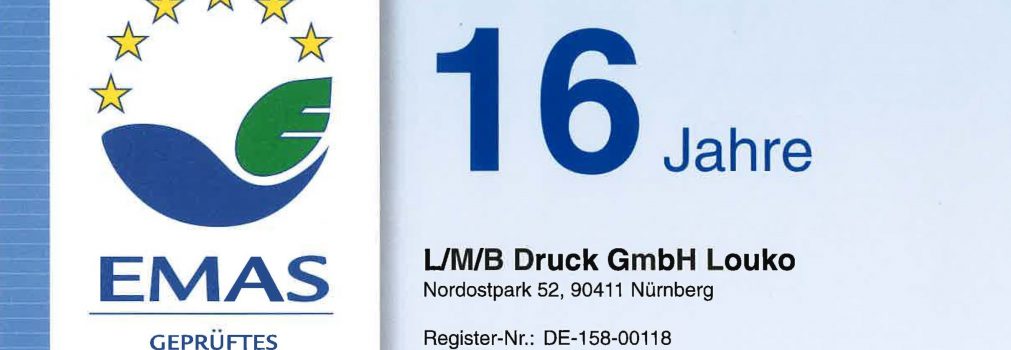 Um unserer Verpflichtung zum ressourcenschonenden und nachhaltigen Umgang mit unserer Umwelt nachzukommen, haben wir unser, seit 2009 implementiertes, Umweltmanagementsystem erneut auditieren und zertifizieren lassen. Die L/M/B Druck GmbH Louko darf das EMAS-Zertifikat weiterführen und hat erneut den Grundstein dafür gelegt, unsere Umweltleistung auch in den nächsten Jahren konsequent zu verbessern.